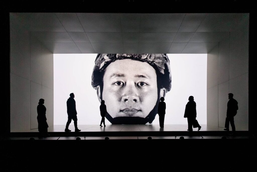 The silhouettes of cast members of “An American Soldier” on stage are pictured, with a close-up of UCLA alumnus Brian Vu as Pvt. Danny Chen in the background. The opera, with Vu as the lead soloist, received a nomination for Best Opera Recording at the 68th Grammy Awards. (Courtesy of Marc J. Franklin and Brian Vu)