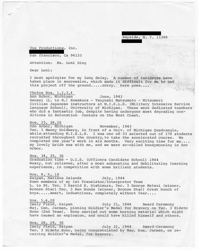 Following the release of Nisei Soldier, Ding’s network among the Japanese American community and beyond continued to expand. Correspondence sent to Ding by fellow academics, historians, interview subjects, community leaders, military personnel, and more, demonstrated the wide scope of her connections that would become foundational for her next film, The Color of Honor. The Loni Ding collection reveals how she enlisted help from the community she had built during production of Nisei Soldier to provide source material for her upcoming work. Examples can be found below with a letter sent by retired United States Army Colonel, Lachlan Maclean Sinclair, where he recommends that Ding contact an Army General and offers additional resources for her research.4 She also consulted with Manny Goldberg, a former member of MIS that served with Nisei soldiers in Iwo Jima and Saipan, to request his expertise identifying photographs.5