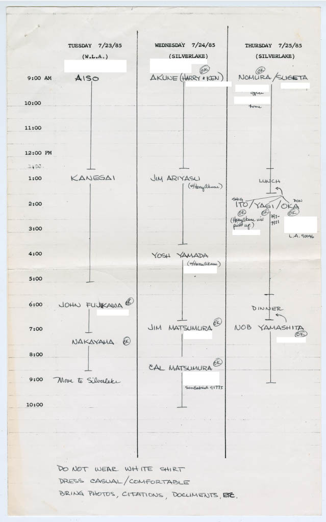 In addition to showing the process of gathering oral interviews and conducting research for preproduction, the Loni Ding Collection offers a behind-the-scenes look at the meticulous planning required to coordinate a film schedule. Ding’s crew often worked at a frantic pace by filming multiple interviews a day across various locations. The image below shows a Los Angeles shooting schedule that could include up to five interviews filmed throughout the day, concluding with a company move in the evening from West Los Angeles to Silverlake. As noted in the bottom left-hand corner of the page, interviewees were often instructed on their wardrobe and reminded to bring materials for documentation.