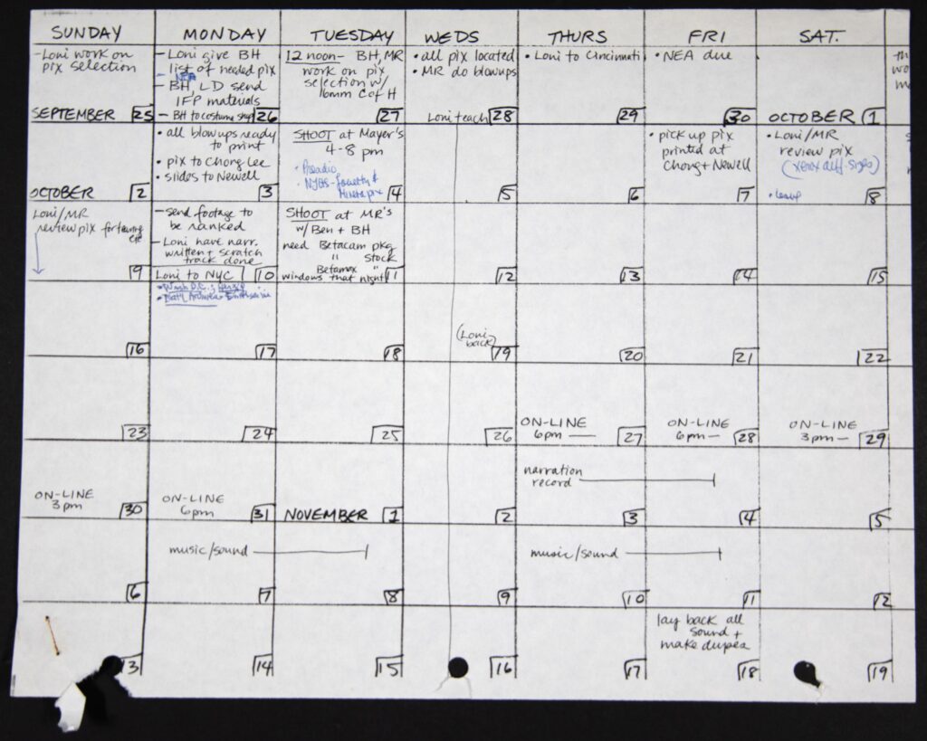 Alongside this three-day schedule is a longer month calendar showing how Ding often traveled between different cities while completing larger tasks for the documentary. Many materials such as these can be found in the Loni Ding collection, that further demonstrate the filmmaking process which can include narration and editor notes.