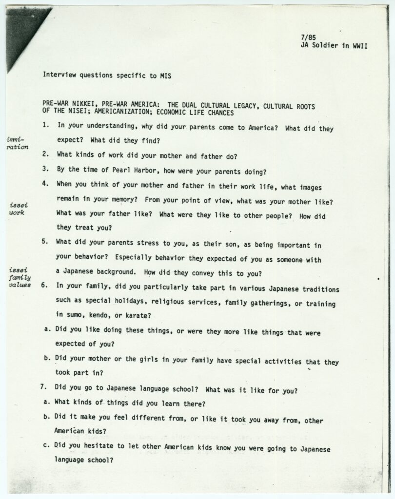 An additional resource found in the Loni Ding Collection includes a list of “interview questions specific to MIS” that were asked during the oral interview.8 While the questionnaire is meant to ask more straightforward questions identifying place of birth or concentration camp, the interview questions themselves engage with more complex themes, such as immigration, family values, and work ethic. When examined together, both the questionnaire and interview questions help to cover any potential gaps in research. For example, the questionnaire can assist in providing the filmmaker with quick access to background information, as this was shot during the 1980s it may have taken longer to review the footage from each shoot.