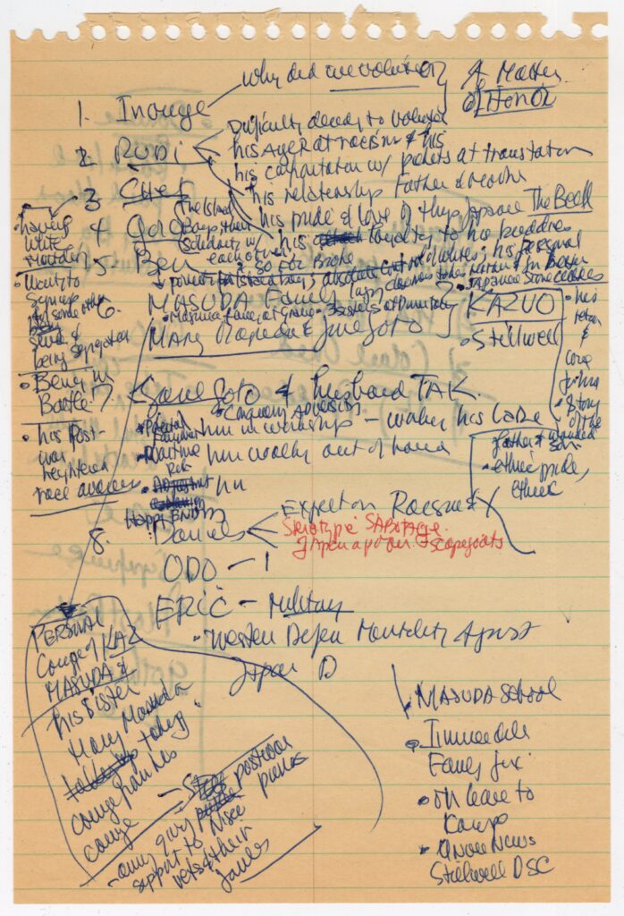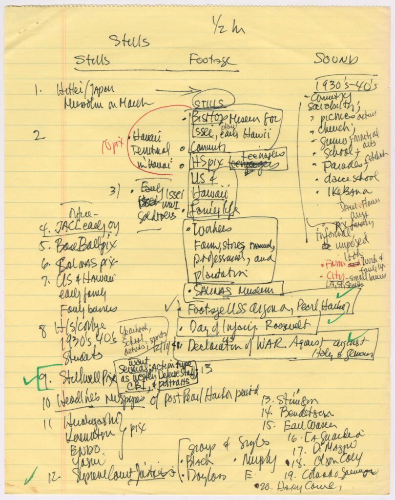 Further insight into Loni Ding’s brainstorming and notes taken during the preproduction process can be found in the following pages from this collection. These notes would represent the early phases of planning of what would eventually become the documentary, The Color of Honor. While these notes may appear at times undecipherable and chaotic, they demonstrate the extensive level of research and planning required to prepare for the film.