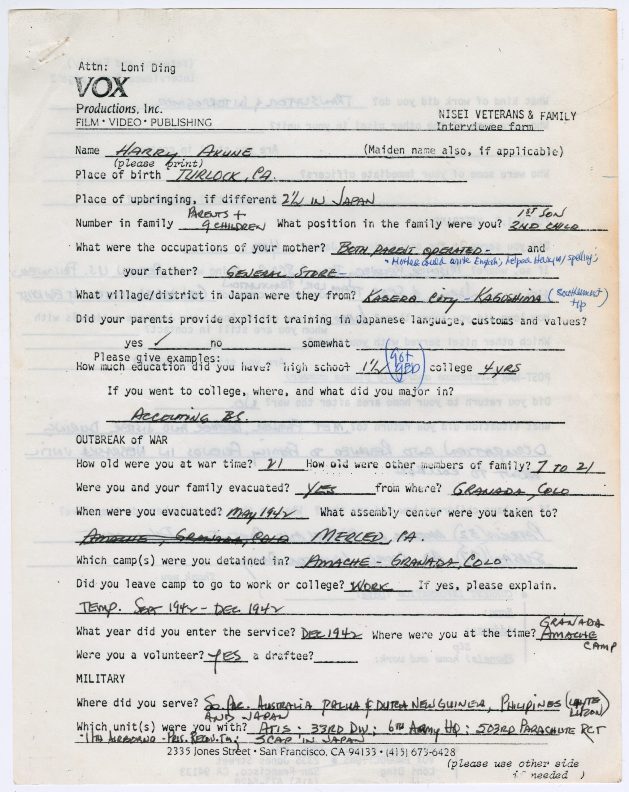 During the interview process, Ding provided Nisei veterans and their families with a questionnaire to help gather information about their background. The example below shows the responses provided by Harry Akune, who volunteered to join the military as a translator and interrogator in the South Pacific and the Philippines. Akune’s responses in the questionnaire are provided in black ink, while additional notes from Ding have been added in blue ink following the interview. 7